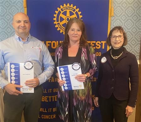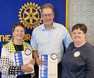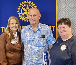 Gary Peters was announced as a PHF+8, and Denise DeVries as a PHF+1 at the club's July 16th meeting.  Denise was surprised by the gift of her PHF+1 from her husband Richard DeVries. Thanks to both Gary and Denise (and Richard) for their support of Rotary! Pictured her (left to right), Gary Peters, club president Kathy VanDewalli and Denise DeVries.