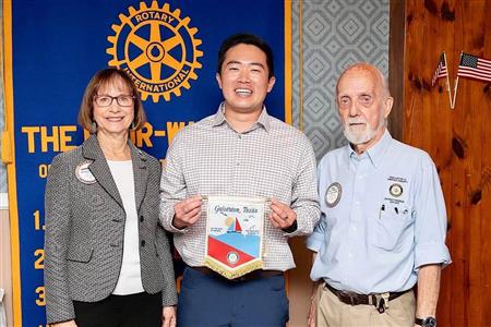 Leonard Wang, 3rd year MD/PhD student at UTMB, was introduced as the recipient of Rotary International's Global Grant Scholarship which he will use to obtain his MBA at Cambridge University in the UK. Wang is currently completing a Master of Science degree in Health & Social Policy at the University of Strathclyde in Glasgow, UK, which was funded by a Fulbright scholarship. Pictured from left to right includes Barbara Winburn, Club President, Wang, and Ulli Budelmann, PDG.