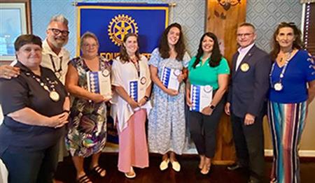 New members installed at the Rotary Club of Galveston’s July 9 meeting. Pictured (left to right): Kathy VanDewalli, president, Rotary Club of Galveston; Leonard Woolsey, publisher of The Galveston County Daily News and president of Southern Newspapers Inc.; newly installed Rotarians Jeana Watts, Michelle Robinson, general manager and chief revenue officer of The Galveston County Daily News; Teagen Tappe Bradley, Lisa Quiroga-Burus and member sponsors Randy Klibert and Mari Berend.